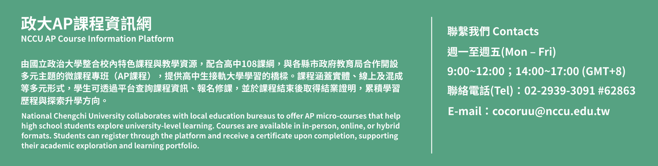 政大開設的AP課程涵蓋多元領域,包含人文、社會、商管、語言、科技等主題,實際開課內容每學期可能略有調整,請參閱本網站最新課程公告頁面以獲得最準確的資訊。